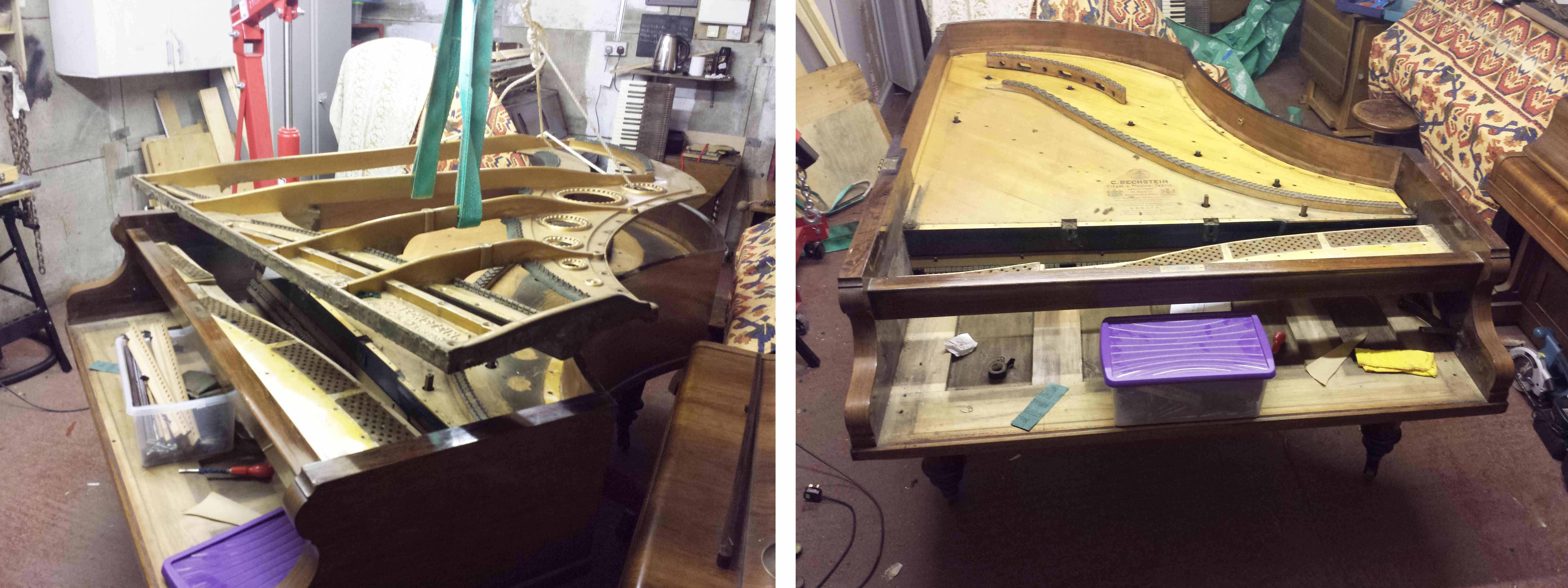 The Crane has been out again as the latest reconditioning job gets underway. Here we have a 120 year old Bechstein grand. The first job is repairing splits in the soundboard, approximately two day’s work (likely to become approximately three days). The hammers are away for recovering in Germany and the Bass strings are with one of the UK’s finest remanufacturers.