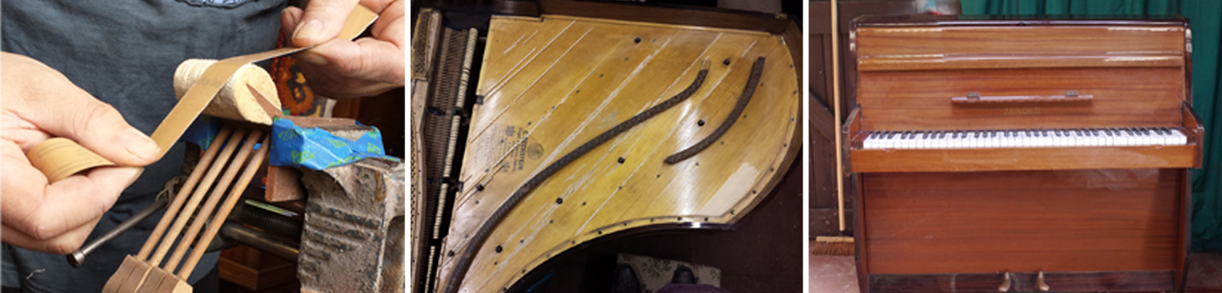 Repair work for April carries on apace. Hammer reshaping on a grand that had been stored on it’s side for many years; a couple of days’ hard work and the 1930’s ‘Ralph’ boudoir grand is back in playing order ( left). Centre picture is the now fully repaired Bechstein Mod. V grand soundboard, with it’s 80 wood shims the soundboard is now whole again! A new arrival at the workshop is a tiny Zender upright (right) which will undergo renovation work as soon as there is workshop space. Due to some sun fading and a few scratches this should represent great value as a musician’s instrument.