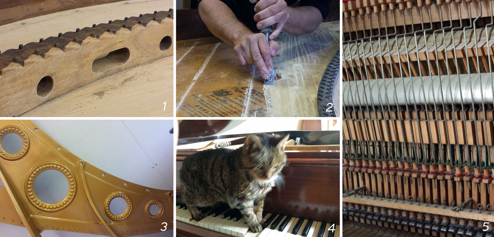 May has been an eventful month and despite a few days off to nurse a cold progress has been good. The soundboard and the bridges of the Bechstein grand are all repaired and nearly ready for the first coat of yacht varnish (1+2). The frame is refinished in gold (3) and time has been made for the regular tuning visits, including a real veteran of an upright from the 1890’s which despite its years and its ancient mechanism was playing reasonably and happy to be tuned at concert pitch (5). It also looks like I finally have a keen helper for my rounds too, she’s obviously quite fond of pianos …or piano tuners (4)