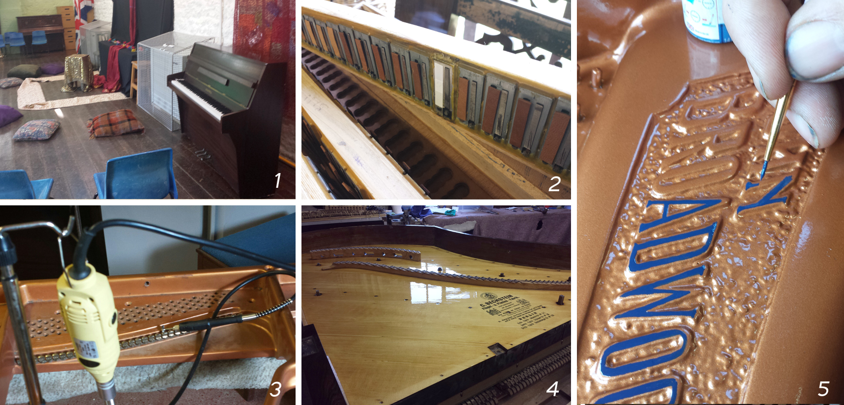 June14_collageThe little Chappell hire piano made an appearance at the inaugural ‘Tandem’ festival, where a great time was had by all (1). Sometimes accordions land on the workshop doorstop and I’m not one to turn away an ailing squeezebox! Quite a few reeds to tune and get working, one or three of them will need new valves (2). It’s always exciting when a new tool comes along and speeds up an otherwise dull and laborious task and the new whizzy dentist drill type mini-brush-wheel thing is great for tiny cleaning jobs (3). The seventh and final coat of traditional polyurethane yacht varnish has been applied and the Bechstein soundboard is looking fabulous (4). A steady hand is a must when re applying the lettering on a grand frame (5)    …remember – clicking on the image will open a nice big version in a new window!