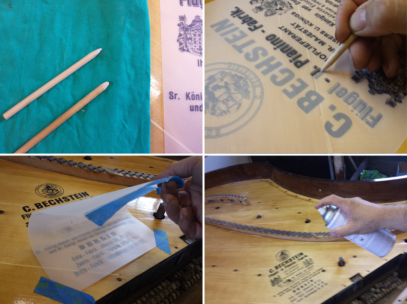Remove the backing paper and while handling very carefully, position the transfer directly over the place it needs to be. Use masking tape all along top edge and at each corner at the bottom to hold in place. Avoid moving the transfer whilst it is against the soundboard as letters may become detached. Transfers are usually applied after the first or second coat of sealant and after a light rubbing down. Apply with a sharpened then blunted hammer shank or similar (pens and pencils are not suitable as the marks they leave will make it hard to see which parts have or have not transferred). After application, mist over with a spray sealant, mist very lightly, about 3 times with a good wait in between. Misting too heavily will spoil the final finish in the area of the transfer. After the recommended drying time a top coat/finish should then be applied.